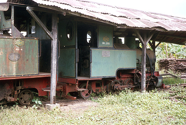 On 20th January 1974, Jeremy Wiseman stumbled on the Cameroon Development Corporation railway which served rubber and oil palm plantations in the Tiko and Bota areas. All steam was out of use at the headquarters at Tiko. 200 was a Jung 0-6-2T (8370/1938) which reflected the country's former colonial past. (JW) |
