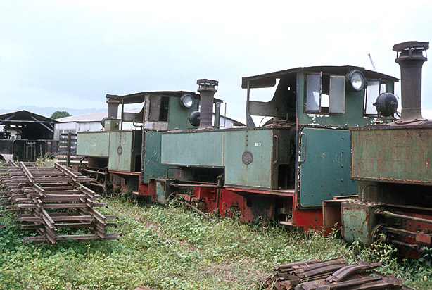 This was part of a former 600mm gauge Feldbahn type system. These two Hunslet 0-4-2T, 2 and 3 (3752 and 3758/1952) had 'For R.Hudson' plates in the manner of by now well-known Trangkil 4 in far off Java, Indonesia, Hudsons acting as agents. Latterly, this was the British influenced area of the country. (JW) |