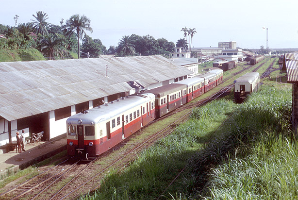 The metre gauge railways in the Cameroons have long been dieselised. The country was firstly a German colony before coming under mainly French influence. The original railway ran from Douala on the coast to Yaoundé. Here a train for the latter leaves Douala station in May 1975. (DM) |
