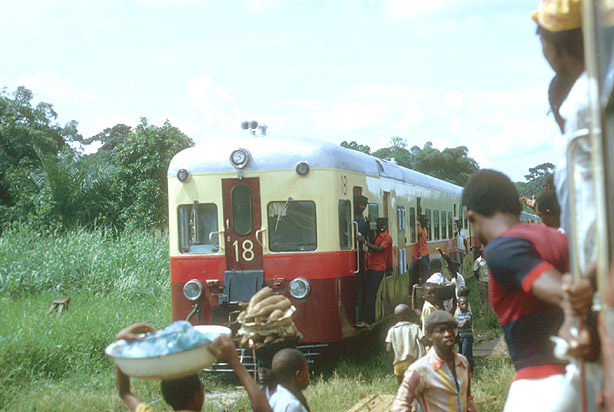 Not far out of Douala en route to Yaoundé, two passenger trains cross. It is quite clear from the condition of the rolling stock and the numbers of passengers (and hawkers) that this was a 'real railway' serving a real need, although the climate has caused the track to be covered in weeds. (DM) |