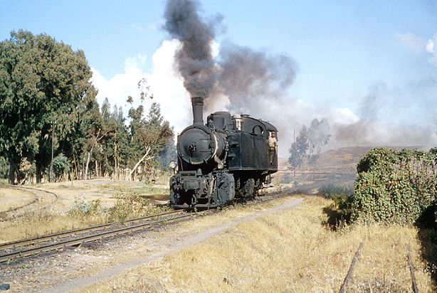 Nearer the city (in practice barely a large town) some trees appear. Another Mallet - possibly 442.58 - (all were of the 0-4-4-0T wheel arrangement) heads for home light engine on 29th October 1966, possibly having been used on banking duties. (JW) |