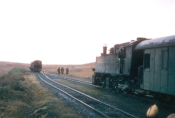 The summit station was about as bleak as you could get. 442.54 on a passenger train from the coast crosses a minimum length freight train on 7th March 1967. (JW) |