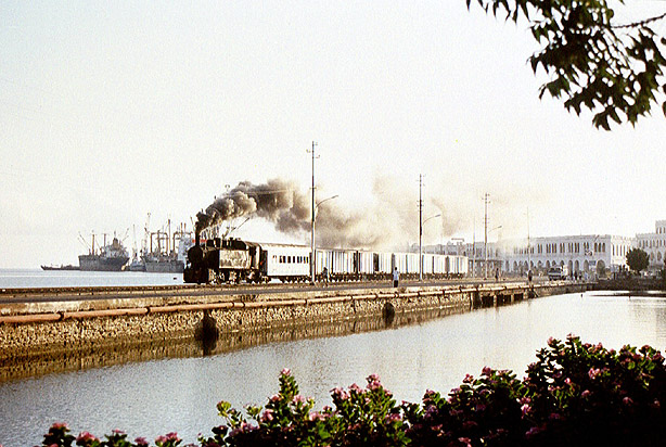 Hans Hufnagel was with the first recent group to visit the railway in December 2000. The port and old town area are on the further of two islands (Batsa) and here 442.54 crosses the causeway to Twalet. In the background are the ships which bring the freight which grinds up the competing road to Asmara. (HH) |
