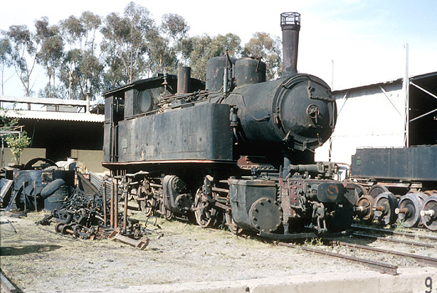 The first Mallets date from around the time of the First World War, several like this one came second hand from Sicily. 440.008 (Ansaldo 1162/1915) awaiting repair in Asmara on 8th March 1967 was a compound Mallet with piston valves for rear (high pressure) cylinders and slide valves for front (low pressure) cylinders. (JW) |