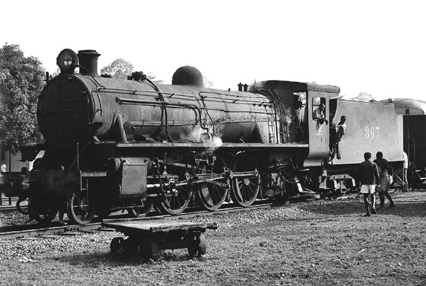 Steam lingered on quite a while in Ghana although few people came here to see it. By 31st March 1976, there was still a little line work. 4-6-2 367 has just arrived at Achiasi Junction with the early morning train from Kade to Huni Valley which will be worked forward by diesel traction. (MC) |