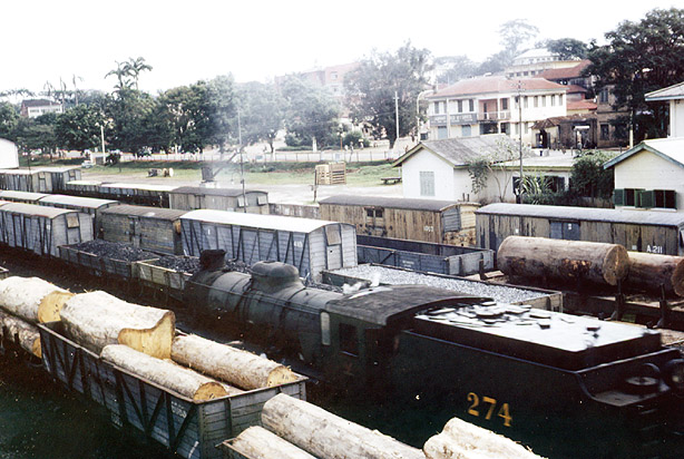 The same locomotive is almost completely obscured by wagons in Kumasi yard in October 1964. At this time, the railway was in pretty good shape and an important contributor to the national economy, a situation which did not last much longer. Today the sidings are almost empty and overgrown. (AB) |