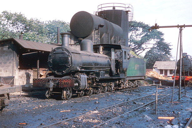 In common with many African countries, the then Gold Coast took delivery of many 4-8-0s in the early 20th century. 173 (Hawthorn Leslie, 3433/1921) was at Accra on 2nd December 1967. The fact that several lasted till the end of steam is testament to the basic soundness of design and their suitability for the railway. (JW) |