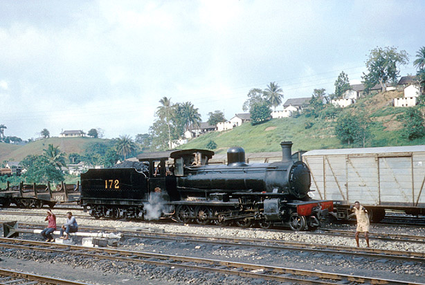 Heading north out of Sekondi on the original Gold Coast Railway main line, the first place of railway significance is Tarkwa. 4-8-0 172 was shunting here on 1st December 1967. In fact, the original driving force for railway construction had been the discovery of gold in this area. (JW) |