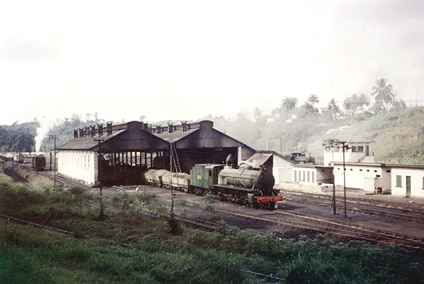 Tarkwa is the junction for the Prestea branch and had a large shed. On 30th December 1964, 4-8-2 266 'Techiman' was outside. (AB) |