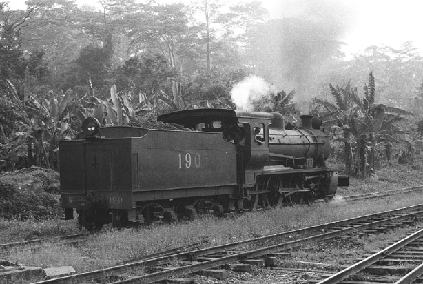 Mark Carter carried on north to Dunkwa, where he found 4-6-0 190 allocated to the Awaso branch train on 3rd April 1976. Here it does some shunting en route. (MC) |