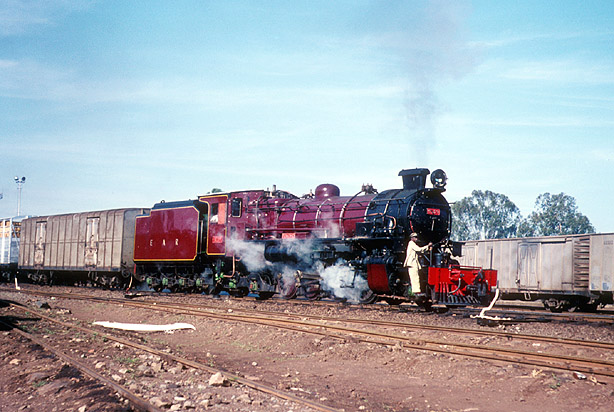 The line which wound around Mount Kenya to the terminus at Nanyuki saw most traffic at its southern end. This line was mainly the preserve of the lighter 31 and 60 class and here 3139 'Pokoma' shunts before working the 09.05 Nairobi to Sagana on 16th January 1971. (TB) |