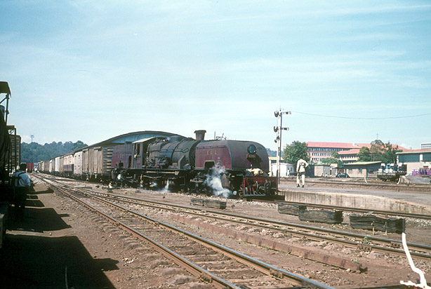 While the 31 class monopolised the shorter workings, more serious power was needed for the full trip. 6001 still bearing the name 'Umoja' is on the 10.20 Nairobi to Nanyuki on 2nd February 1971. The East African (now Kenyan) Railway headquarters buildings are in the background. (TB) |