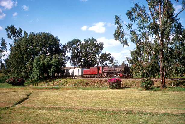 The original route out of Nairobi followed what is now the Uhuru Highway. 3020 'Nyaturu' leaves Nairobi with a pick up goods in August 1976 along the first part of the new alignment which skirted the built up area to the west of the city. (DM) |