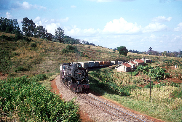 The climb from Nairobi to the edge of the Rift Valley was a severe challenge for man and machine. 2914 'Kamba' rounds Hospital Curve just outside Nairobi on the 16.20 goods for Nakuru on 29th September 1972. (TB) |