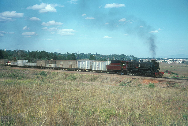 During an earlier visit on 19th January 1971, the same train was hauled by 2902 'Bukusu' and was photographed down Sykes Road on the outskirts of Nairobi. (TB) |