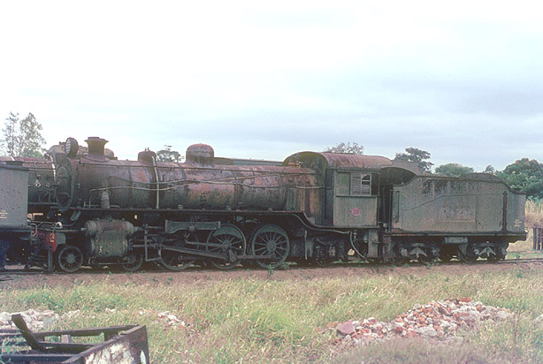 The southern Trans Zambesia Railway was actually in Moçambique bought six 'WD' 4-6-2 Pacifics in 1946 which were identical to the Sudanese 220 class. 'F' class 28 was photographed dumped at the TZR workshops at Inhaminga near Sena in August 1968. The 'E' class were short lived 2-6-2 + 2-6-2 Garratts. (BR) |