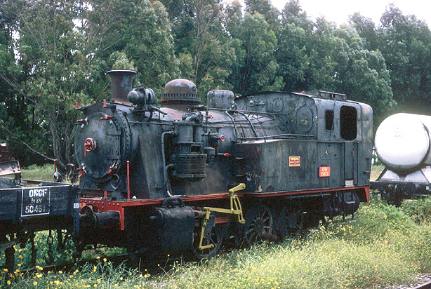 The dubious privilege of being the last working steam locomotive in Morocco fell to this Henschel 0-6-0T (26549/1942). Originally ordered for China, it was sent to France for assembly in 1945 and ran as SNCF 030TX-1 before transfer to Morocco. On 22nd May 1980, it was parked out of use in a siding at Taza. (JW) |