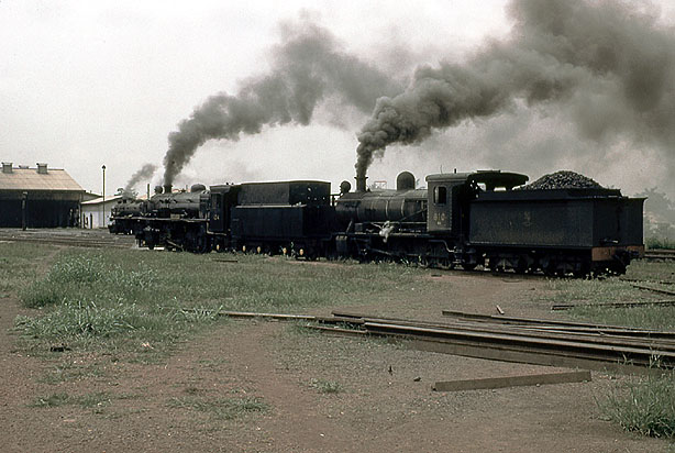 Andy Nimmo worked as a volunteer in the Enugu area in the east of the country during July and August 1960 when he took the pictures in this section. Here are 4-8-0 610 and 2-8-2 104 'River Oyon' on shed there. (AN) |