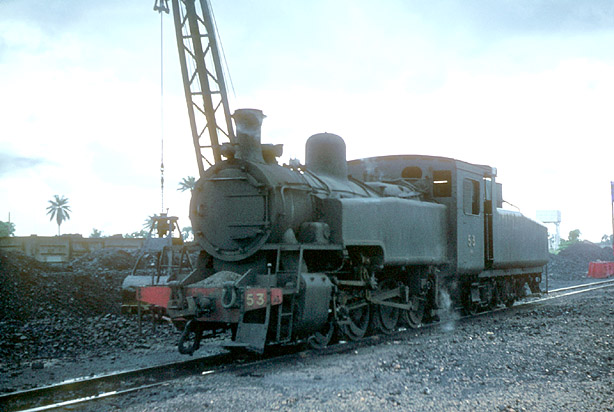 0-8-0T+T 53, was one of 30 built by Hunslet between 1925 and 1949 for mixed traffic. It was photographed shunting at Port Harcourt in 1966. (CS1) |