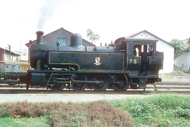 Hunslet 0-8-0T, 75 (3346/1947) was a shunting locomotive of a design which can also be seen in the Ghana section. It was photographed at Abeokuta on 22nd November 1963. (JW) |