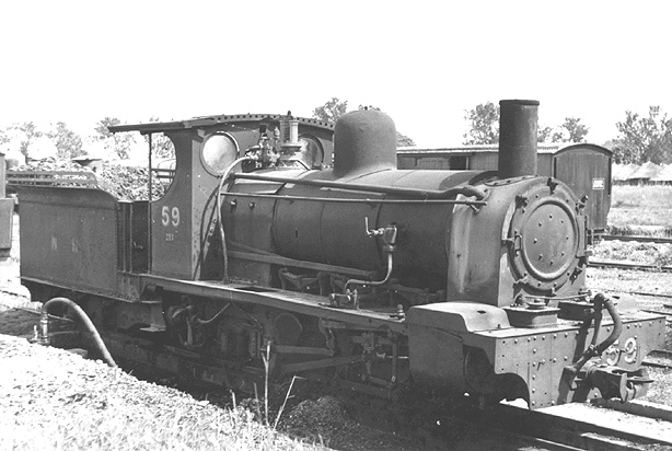 The 2ft 6in (762mm gauge) Bauchi Light Railway was a cross-country railway which survived until September 1957. Line locomotives towards the end were these Kitson 0-6-2s, of which 59 was photographed after closure about 1960. (PM Collection) |