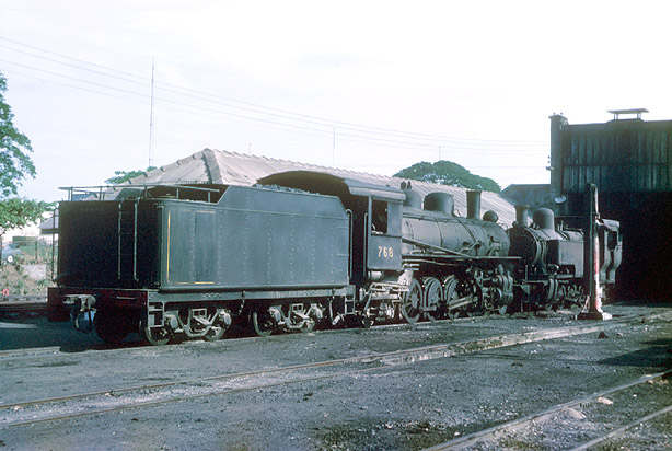 This is a rear end view of another 2-8-2, 768 at Ebute Metta in 1967. These post-Second World War locomotives were built by the Montreal Locomotive Works. (JD) |