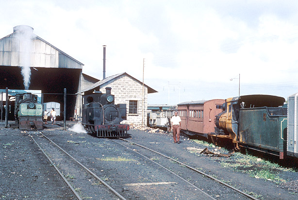 On 20th November 1967, Jeremy Wiseman paid his second brief visit to the Sierra Leone Railway. On shed at Freetown were 4-8-2 + 2-8-4 Garratt 64, a Hunslet 2-6-2T and a Bagnall 4-8-0. (JW) |