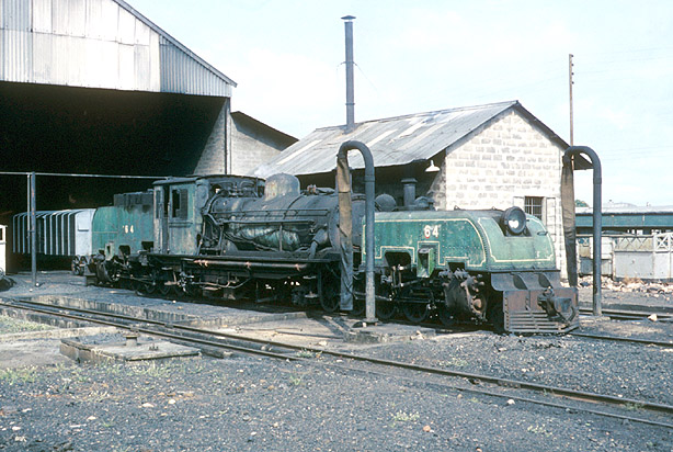 The 4-8-2 + 2-8-4 were remarkable machines. At 70 tonnes, on a railway restricted to a mere 5 tonne axle load, with a tractive effort of 11 000 kg, these locomotives could haul 270 tonne trains up 1 in 50 grades. Originally coal burners they were later converted to oil which could be imported from Nigeria. (JW) |