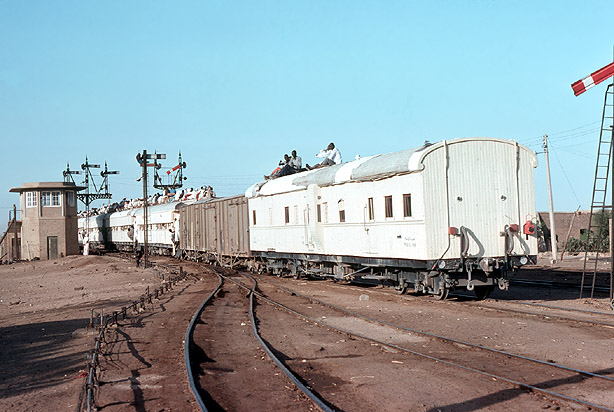 On 6th February 1976, a diesel hauled express for Khartoum leaves Sennar with its obligatory complement of roof travellers. (RK) |