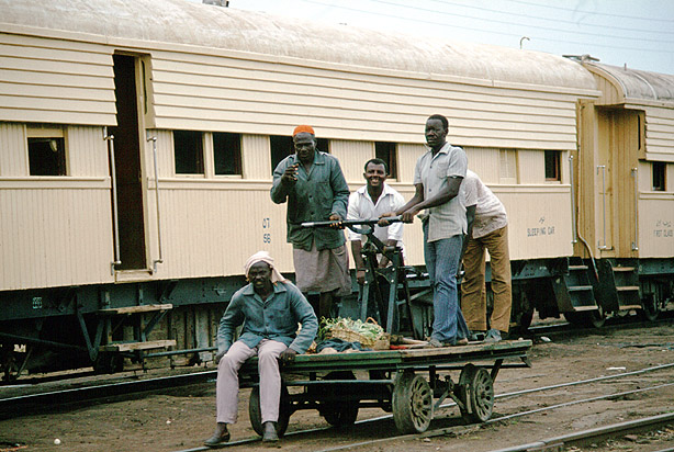 The first TEFS tour to Sudan was very much a trip into the unknown. A certain amount of 'iron rations' were taken but otherwise meals were taken as and when circumstances allowed. This is lunch arriving on a trolley at Sennar Junction on 12th September 1981. (JA) |