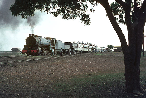 The photographer was pleased to see 4-8-2 502 back on to the train for the run on to Kosti from Sennar and in fact on this trip not a single diesel was seen beyond that point. Here it pauses at a typical intermediate station in the middle of nowhere. (GH) |