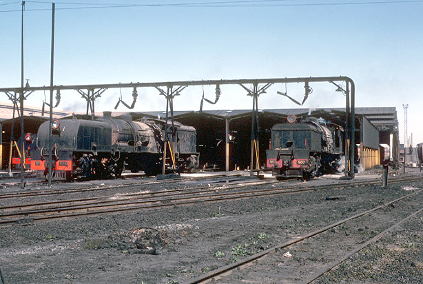 Back on the 'real railway', facilities were less than ideal. By 22nd June 1981, workstained original 14th 507 (recently restored to traffic) and later 14A 525 waited outside Bulawayo shed to go about shunting duties in the station area. (BA1) |