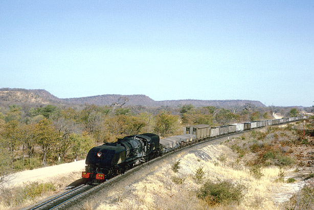 This one shows a train heading in the opposite direction. 15A 410 heads through the bush with train 20 north of Entuba on 22nd July 1991. The lack of exhaust clearly shows the gradient is with the train here. Most of the photographs in this section show southbound trains so this is the direction we travel. (BA1) |
