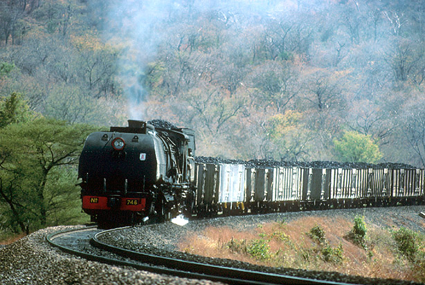 20A 746 rounds the curve approaching Lukosi with a full load of coal from Wankie on 3rd August 1991. (KC)