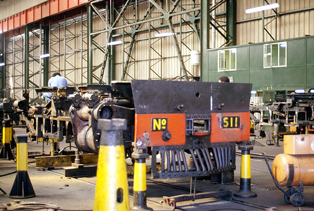 The next few pictures were taken in August 1985 and clearly show the extent of the rebuilds undertaken here. Unfortunately, maintenance standards on the railway were declining so all the good work did not last long. This shows the frames of 14A 2-6-2 + 2-6-2 Garratt 511. (BA2) |