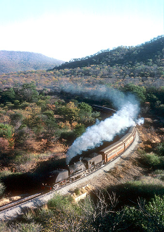 During 1980, the passenger train from Thomson Junction to Bulawayo (train 111) ran in the daylight as a result of 'the troubles'. This continued even after the curfews were ended after independence. On 25th May, 15A 419 rounded Tajuntunda curve in the early morning. (RD) |