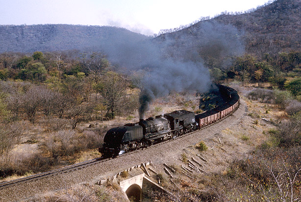 Just over 10 years later on 28th July 1991, Bryan Acford visited the same spot, irreverently known as "Christine's Backside". Very dirty 15A 422 'Inkonkoni' (Wildebeest) rounds the curve with coal train 31. The 'real' Zimbabwe Garratt story was rapidly coming to a close. (BA1) |