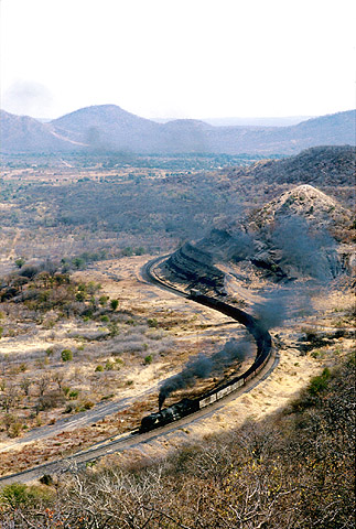 While it had always been possible to sit and listen to Garratts pounding past the Baobab Hotel, only in later years was a clearing made which allowed you to observe them too. A 15A pounds past on train 29 on 25th July 1991. Only the terrace of the Victoria Falls Hotel offered a more refined viewing point than this. (BA1) |
