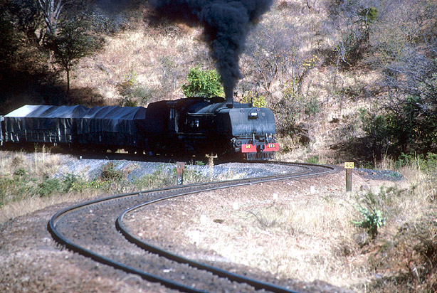 16A 613 (formerly 645) heads up the climb through the Mulungwane Gorge on 30th July 1991. The telephoto lens exaggerates the curves but nevertheless vividly illustrates why powerful articulated locomotives were needed here. (KC) |