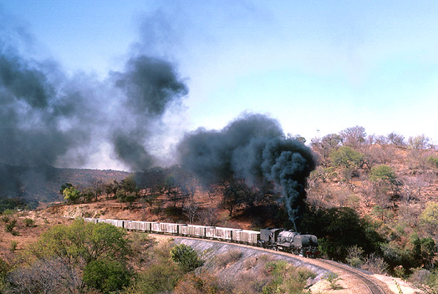 We have already seen 16A 602 (formerly 626) at dawn on 1st July 1987 with train 314. Some time later it exits the Mulungwane Gorge with open country all around. (BA1) |