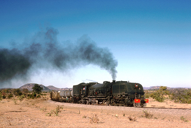 Up till now the majority of shots have been of northbound trains as the light and the gradient favours them photographically. By way of a change this shows 16A 614 (formerly 647) on train 317 approaching Glass Block siding heading for Gwanda on 10th July 1987. (BA1) |