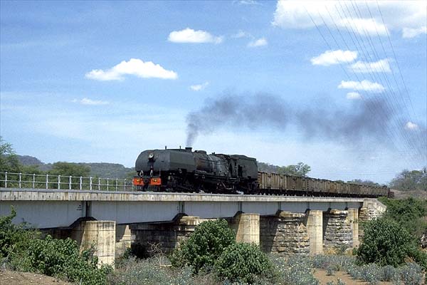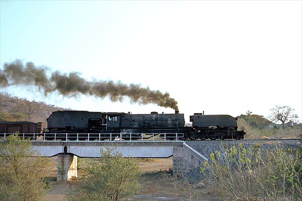 On 17th September 1984, a 20th heads a late afternoon freight for Victoria Falls and crosses the almost dry Deka River as drought sets in.