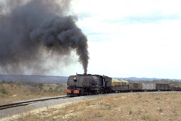 Esigodini (Essexvale) was often used as a crossing point and whilst there was a climb out of there the heavy lifting was in the vicinity of Tank and Bushtick and onward to Heaney Junction. I had been hoping to see a 14A on a freight, supposedly a rare occurrence, but over the few days I was here I saw at least one in use in each direction. By the time trains reached Bushtick the mornings were hot and humid. Clag was the order of the day as trains made the ascent from Tank usually with a vertical column of smoke looking as if a mechanical stoker was in use. Some trains were able to gain speed racing around the S curves at Bushtick, but more often it was ongoing slog with the firehole door opening and closing as the fireman sweated to keep up steam. It made for good video. Some engines passed with a clear stack, but the racket they made was evidence of the sustained hard work required at this remote location. Generally a couple of shots could be obtained between Bushtick and the summit, but I was warned by a crew that the road was in poor condition. They had rescued an injured fan whose car had overturned on the corrugations, they told me it took a long time to get him to hospital. I could see how suited the 16As were for hauling heavy trains on this steeply graded branch line. The firemen had a tough time feeding the fire and producing some memorable stack-talk. This ends my brief review of Zimbabwe, I had enjoyed my time there thanks to the friendly crews. 14A 516 departs Esigodini for Bushtick. Jacaranda trees are in bloom in the background, 24th October 1986