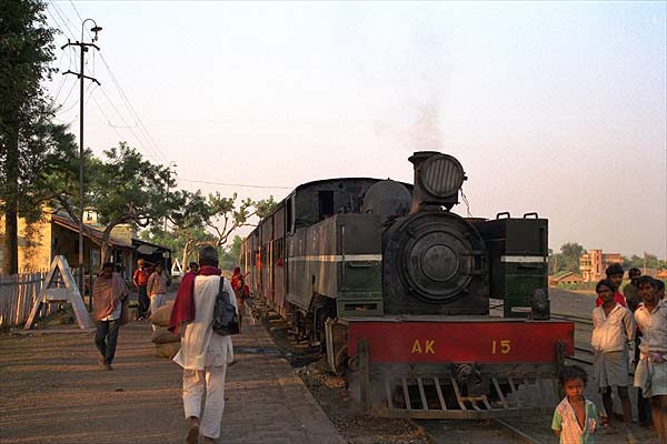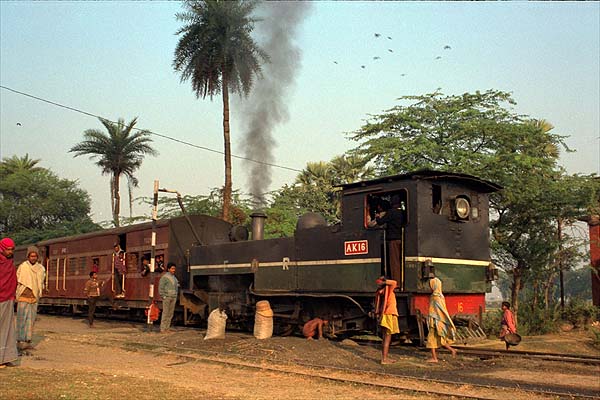 ![]() Ahmadpur We arrived at Ahmadpur around 05.20, not surprisingly it was pre-dawn. The engine did a spot of shunting and was ready for departure at 07.00, (instead of the advertised 06.22 departure). This should have helped with the light, but a watery grey sky gave no incentive to photography. As the morning warmed up passengers began to stow their shawls and blankets. The Delta was now leading cab first, the bunker was alongside the boiler giving the engine an unusual appearance. The revised timetable meant we had missed the 08.10 departure at Katwa, instead we crossed one of the Bagnall 0-6-4Ts on this train. AK 16 on the morning train from Ahmadpur