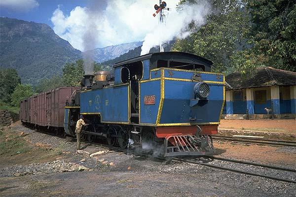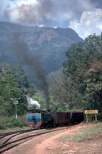 I had arrived at Mettupalaiyam after a trek from Bombay behind growling diesels, the sight of a steam engine at the shed meant the line was open. It had been a long journey and the Ooty line (like Darjeeling) was a bit of a gamble as to whether it would be open. My 1st class ticket cost 50rp which was expensive by Indian standards. I sat in the front compartment of the lead coach which, like an observation saloon, had windows at the front. Amongst the passengers were a newlywed couple, the groom was a Bombay businessman. Thanks to Bollywood both Ooty and the Niligiri train had become trendy and were favoured by honeymooners. Like Darjeeling Ooty had good schools and Indian rail workers still tried to send their children to board here and learn English as well as the regional and the national languages. X 37391 “Bhagratha” was he engine for the rack journey and it was a fabulous trip, with wonderful views and the engine being thrashed on the rack section that starts at Kallar. The flagmen had to relay signals to the driver as the track is heavily curved and clings to the mountainside, once the rack was engaged the train ascends gradients of 1 in 12 and the noise from the hard working engine was wonderful to hear. 3rd January 1989 was my final morning and saw me back at Kallar. I had taken a taxi that freewheeled downhill Runneymede where I found a spot to wait for the train Niligiri Express from Mettupalaiyam. A few hours later and the train had still to appear, I had been watching monkeys swinging between trees when a track gang appeared. I was told there was a dead elephant on the line blocking the train and they needed a Forestry official to give permission to remove it; surely a story like that would have to be true! The taxi rolled downhill towards where the train was supposed to be stuck, I found it would be a long trekk up the mountainside to reach the line, instead I sipped a freshly cut coconut and decided to call in at Kallar and ask the station master for news. The station master was asleep but his assistant told me there was no dead elephant and there had only been a minor derailment, the train which was now at Coonoor; however they were expecting a coal train from Mettupalaiyam. This was a real bonus as freight traffic was limited to the occasional coal train to Coonoor loco shed. The freight appeared five minutes later with 37395 pushing three bogie trucks with brake and flagmen riding the wagons. Here it is prepared for the rack section.