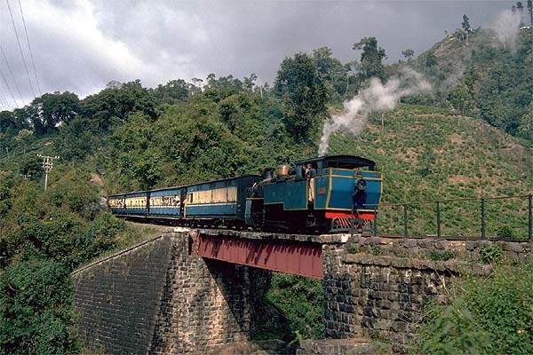 After watching the train engage the rack and depart I found a couple of distant views of the train and the mountain before getting ahead and giving me time to walk down from Kateri Road to the tunnel. I was able to get some excellent video of the train exiting the tunnel with the rack motion working at speed. Two more shots from the roadside followed, but we were prevented from going to the station at Coonoor as the police had blocked the road, due to a political rally. Runneymede was a favourite location, an easy walk down from the road through tea plantations gave the opportunity to see the train working hard on the approach. The station was officially closed, but the buildings remained in good repair. I headed there on New Year’s Day, leaving Coonoor the taxi passed crowds of people yelling “Happy New Year”. Some were heading to local pilgrimage sites, as elsewhere in India there seemed a mixing of beliefs and images of Christian saints being paraded were venerated by both Christians and other religions. Waiting groups of monkeys sitting on the roadside walls, were also hopeful of offerings. Long before the train came in view it could be heard labouring upgrade on the rack. There was time to watch the engine take water and the fire being cleaned before the train re-started and engaged the rack again before it crossed a bridge that spanned a river far below. A mad scramble followed back uphill in the hope of reaching the tunnel exit, but the best plan was to make one or the other your shot as asthmatic taxis had trouble on the steep hill road. There were other opportunities, I was using video to take close-ups of the rack motion on the engine at work. Departure from Runneymede. 1/1/89.