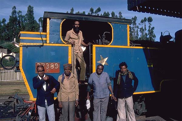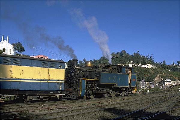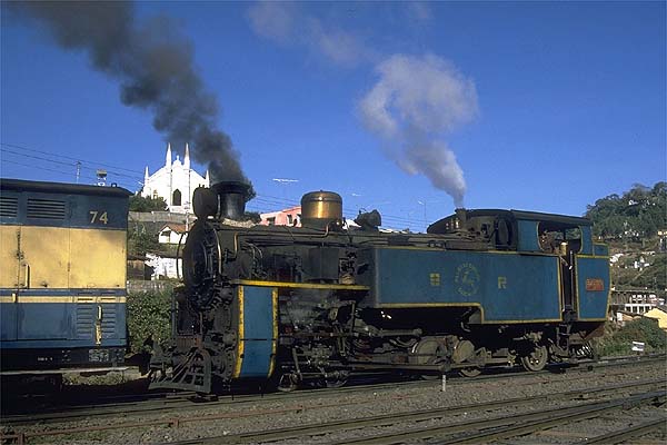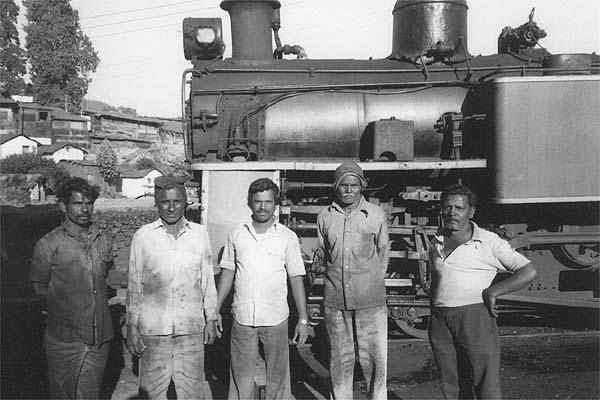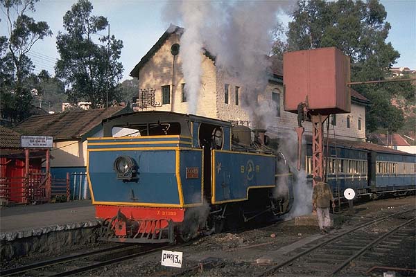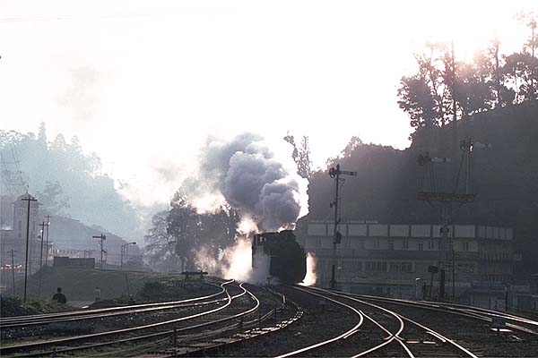 Trains leaving Coonoor on the non-rack section first backed out of the station onto a spur, as the platform is curved relay flag waving was needed to get the train on the running line. Then after the carriage flagmen had relayed the guard’s flag the engine charged upgrade past the signalbox and really got stuck after passing the shed and kept up a furious racket to Wellington the first station stop. One morning I had a cabride from Wellington to Ooty. The footplate was incredibly noisy and this was without the engine working with its rack gear. Unlike other mg engines I had ridden the footplate was cramped and the firebox doors were low requiring the fireman to use a short handled shovel and bend low as he fired, the second fireman operated the doors to keep the fire white hot; both wore sandals. Whilst it took a lot of firing to keep the pressure up, the engine steamed freely. When the fire-hole door was open the noise in the cab increased, and as we passed through the two tunnels the sparks flew around inside the cab. The driver used the reverser to control the speed; he drew my attention to the large brass plate with reverser positions notched on. I was assigned a perch was on an open shelf behind the driver. I sat in a hunched position to stop my head striking the roof when I got the odd bounce as a result of the engine’s lively antics. It was hard work for the fireman, I guess it would have been harder still on the rack section, but the crew did not complain. 37389 having backed down from the shed approaches the station, 2nd January 1989
