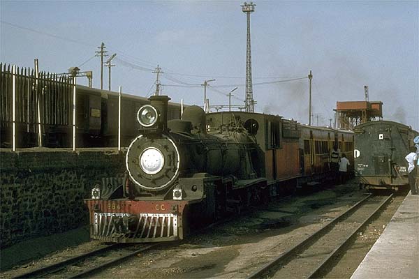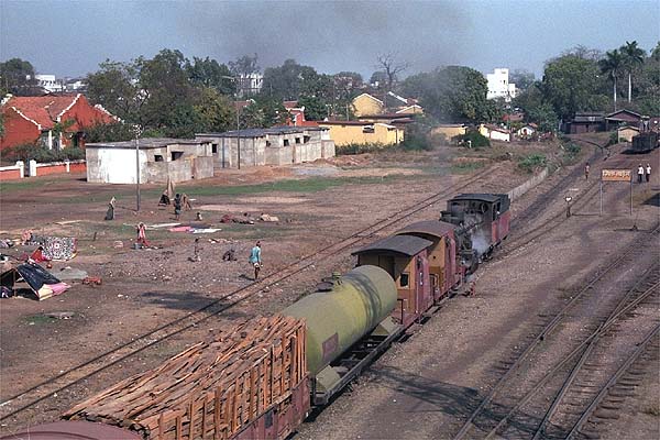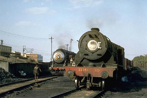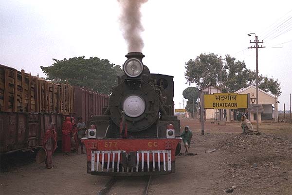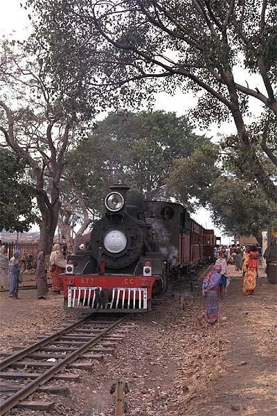 ![]() I returned to Raipur on 21st January 1985, arriving on an early morning train. XDs remained in use as pilots, they were now a rare class, steam was rapidly being decimated. After a wash in the unhygienic waiting room I went to the ng station as darkness was lifting. CC 669 was being warmed up for pilot duties, whilst at the bg stabling point XD 22315 was being readied together with 22305 for taking over as the daytime pilots, moving out at 06.30. This was the time the ng passenger was supposed to depart, but the engine was not ready. I had time to contemplate the bulk of the XDs and the lean sleek lines of the old pacific. The narrow gauge train got underway thirty minutes later, the light rain intensified as the train got underway, disturbing clouds of mosquitoes that had made the carriage their home for the night. There was to be no sunrise. At Bhatgaon the rain began to clear, 675 (NB 1907) was in the loop with an lengthy incoming freight, most wagons were double bogies and there was even an oil tanker in the rake.