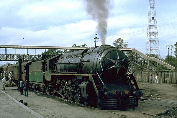 It came as a shock to find both the driver and fireman wanted me to have a go at driving, when I sat down on the driver’s seat it dawned on me the fireman had been using the reverser to control the engine, the fireman confirming the brake did not work. I open the regulator and the locomotive gently moves forward, the driver signing me to use more regulator. I realise that the reverser readings were incorrect; we should be cantering along on these settings! I shut the regulator as the head shunt comes into view and start slowly rewinding the reverser, the driver wants the regulator open, so the engine goes gently into reverse, I think of the damage being done as we skid slowly to a halt. Next we propel the load over the points to the end of the carriage yard, this presents a new problem as I cannot see where we are going and do not understand the shunter’s whistle code. The driver urges me to be less cautious as we repeat the operation and I start to get the feel for it just as we finish the shunt. I returned to Pune on one of the steam hauled passenger trains, it was a laid back affair with numerous permanent way restrictions. Despite the generous time allowed for engine change, we still were an hour late ex Daund and not with the expected diesel, but with a WP. I was pleasantly surprised that the crew who had been rostered for a diesel got the WP working hard to maintain the schedule. There was plenty of whistle blowing approaching crossings at speed and the engine was worked smartly away from stops, a good way to end the day and my last visit to Kurduvadi. On the earlier visit, WP 7744 departs on a passenger for Pune, which it will haul as far as Daund, 22nd January 1983.