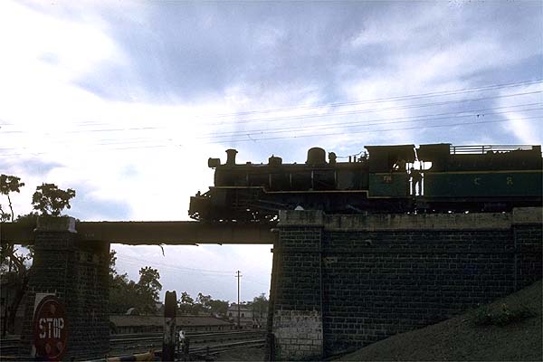G 728 crosses over the bg with a train to Pandharpur, 22nd January 1983